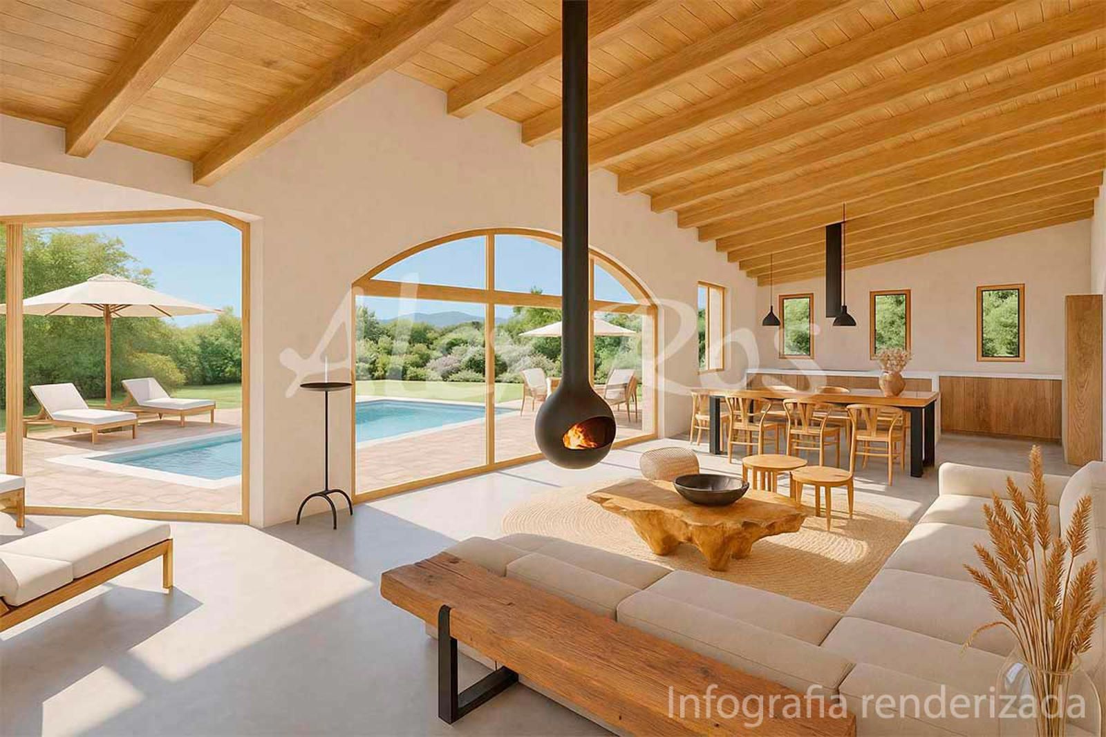En planta: Gran salón con salida directa al jardín y a la piscina, Comedor amplio con cocina abierta, Habitación suite, Aseo, Chimenea.