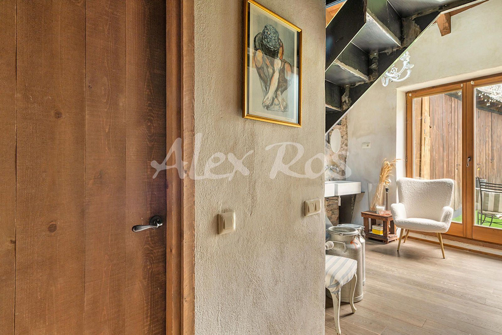 Salón con chimenea y salida a terraza.